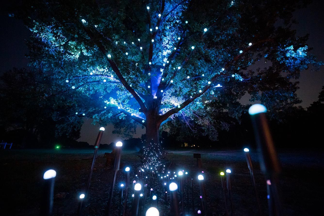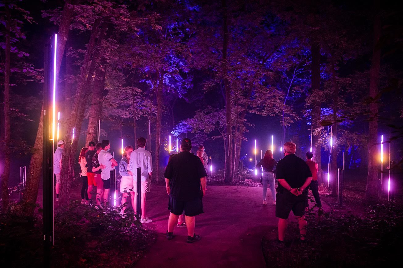 Crystal Bridges partnered with Montreal-based multimedia and entertainment studio Moment Factory to bring this concept to life. In 2020, Moment Factory won the mondo*dr “Americas Award” in the Parks & Attractions category for their work on North Forest Lights.