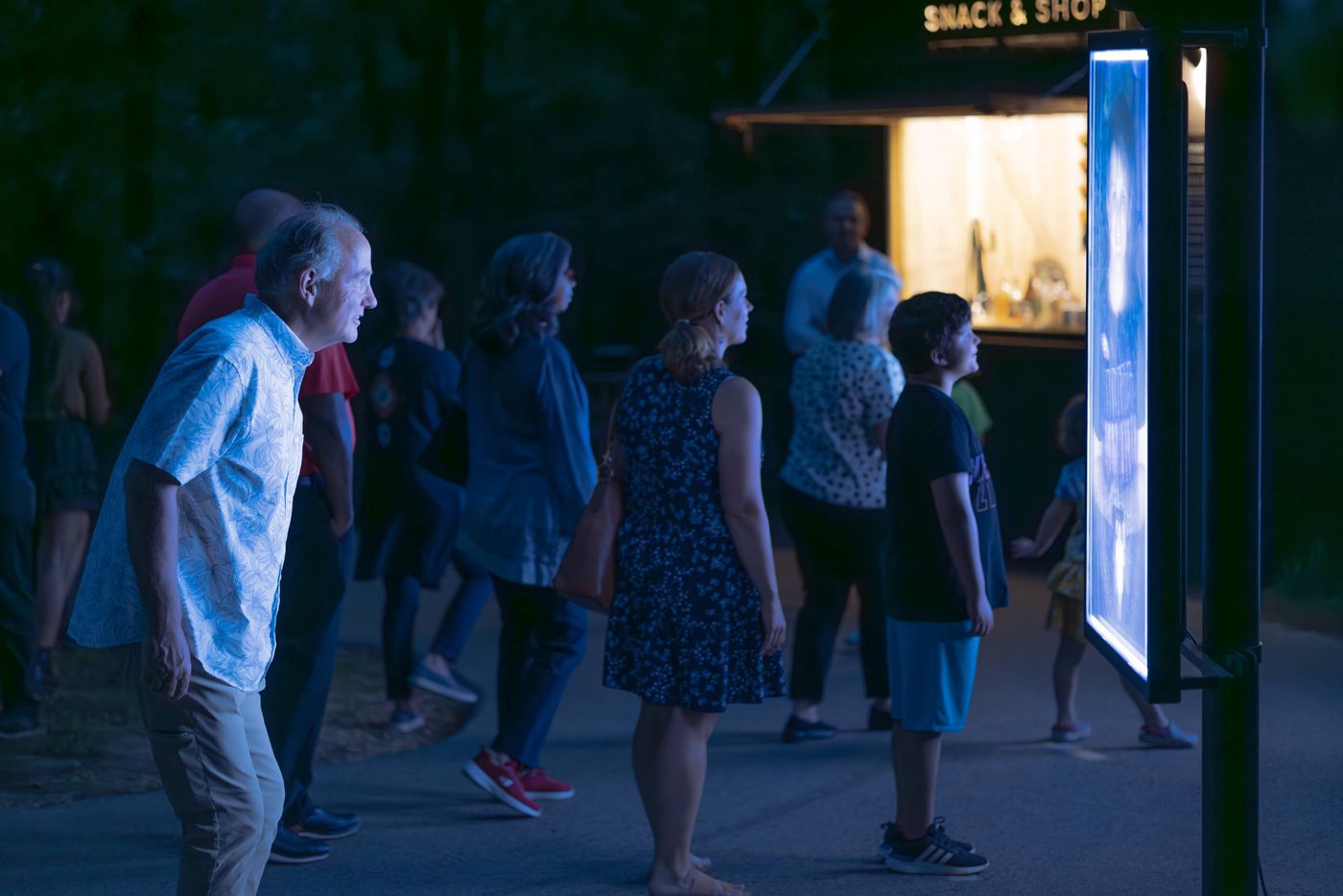 Become a giant of light towering over the trees. Plant a heartbeat in a field of 3,000 lightbulbs. Wade through a moving river of poetry, and more as you venture through this outdoor, nighttime experience.