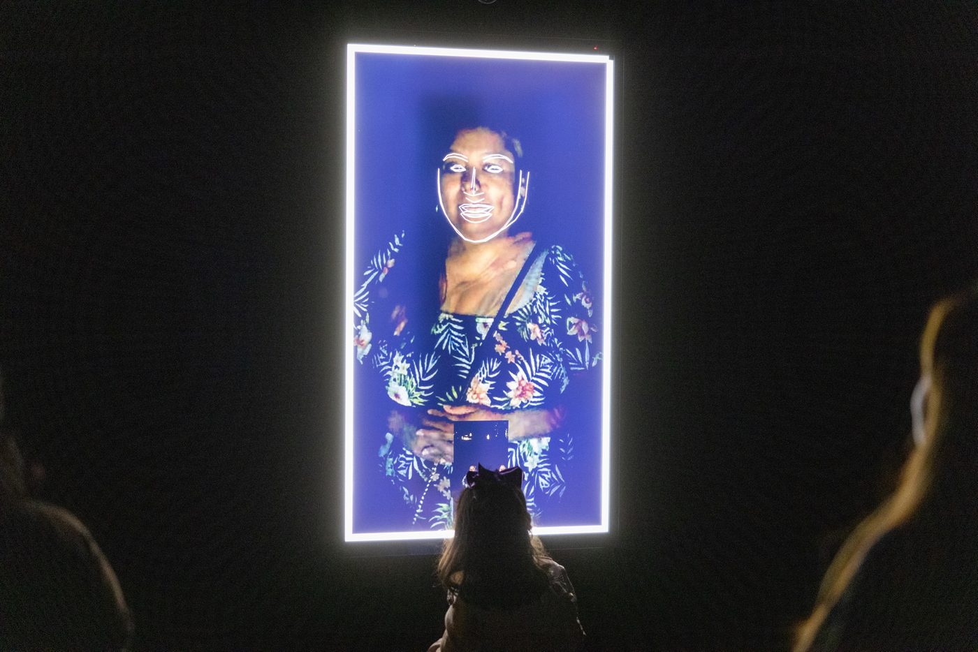 A young girl stands facing a screen outside at night that displays a face blurring and combining into a composite portrait.