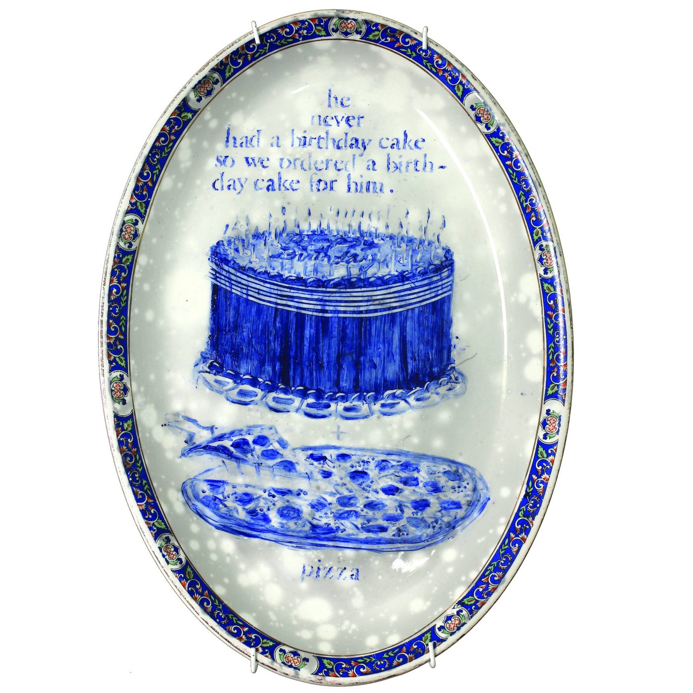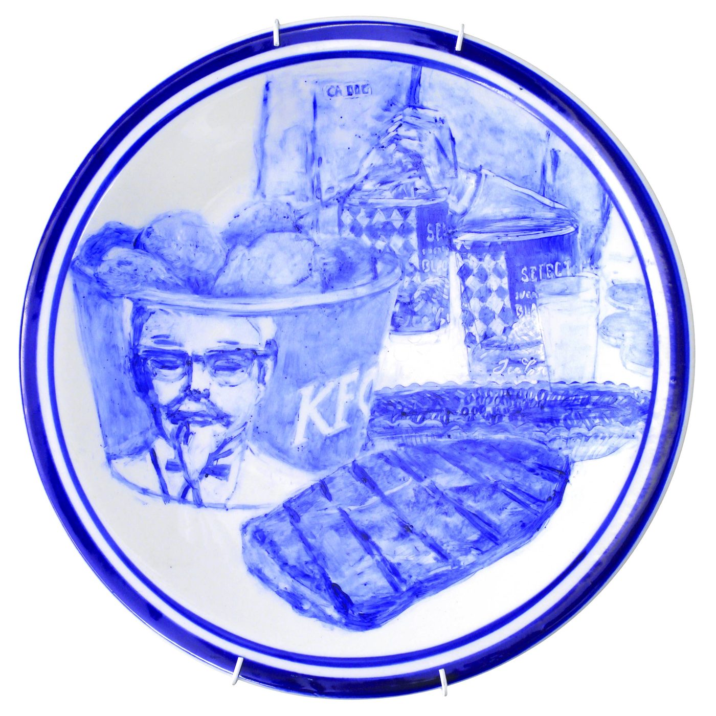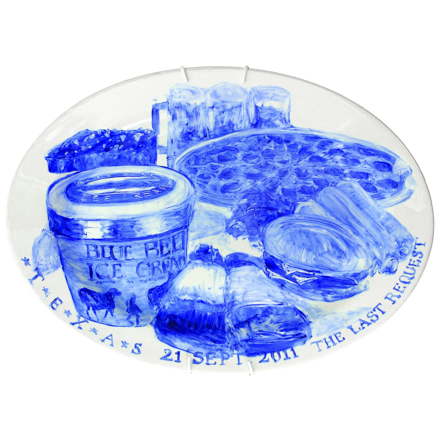 Using cobalt blue mineral paint on second-hand ceramic plates, Green (they/them/their) intended to paint 50 plates a year, spending their winter months on The Last Supper and ending the series upon the abolition of capital punishment in the United States. At the time of the artist’s death in 2021, the project encompassed one thousand plates.