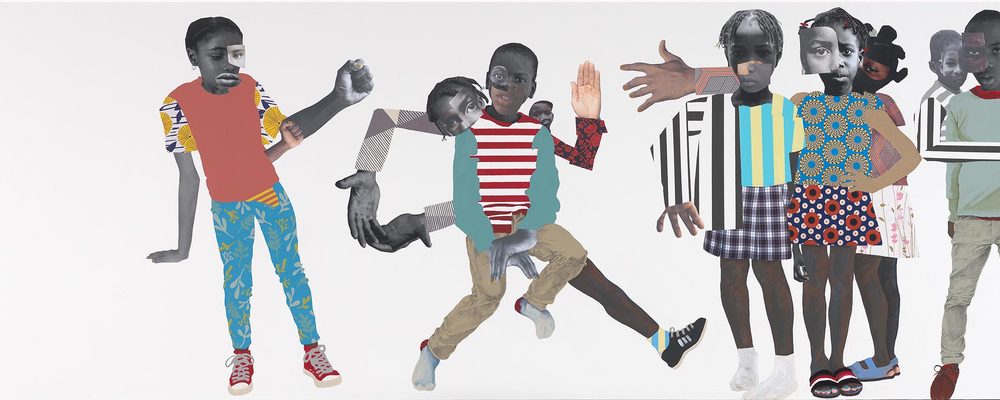 Deborah Roberts, Let Them Be Children, 2018, acrylic, pastel, ink, and gouache on canvas, 46 1/2 x 141 3/4 x 2 3/8 in. Virginia Museum of Fine Arts, Arthur and Margaret Glasgow Endowment, 2019.1