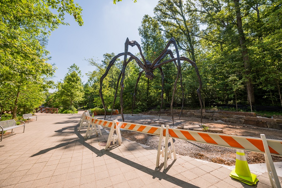 When you come to the museum, you might notice that Maman, the 30-foot spider sculpture by artist Louise Bourgeois that has greeted visitors to the museum for the past few years, is not in her usual spot in the courtyard. Not to worry! She was moved from the museum courtyard to the South Lawn near the Twin Bridges in the spot where Luis Alfonso Jimenez’s Vaquero used to be. Vaquero has moved from the South Lawn for conservation and will be on view again in a new location soon.