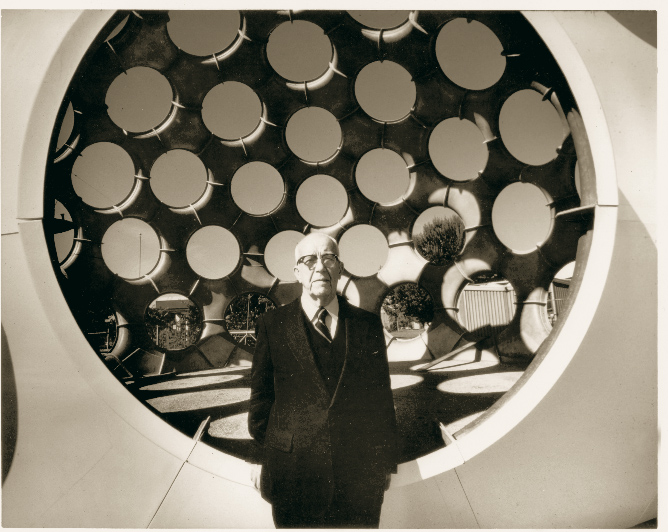 All of Fuller’s work and innovation came after a breakthrough he had in his late 20s while struggling to find his purpose in life. His epiphany was the idea that he was meant to give himself to the universe, to “convert his experiences to the highest advantage of others,” as he later recounted. An early environmentalist, he popularized the belief that we all must work together and share limited resources in order to survive on earth. With this in mind, he created housing designs that would benefit the greatest number of people while utilizing as few resources as possible.