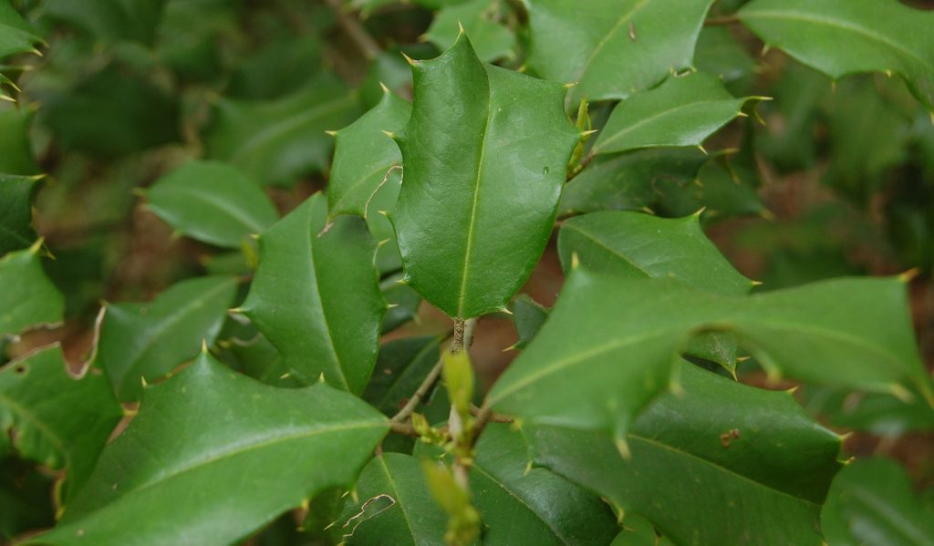 Leaf type: Dark, evergreen leaves are 1-3 in. long with 7-8 sharp, spiny teeth along the margins of each side.