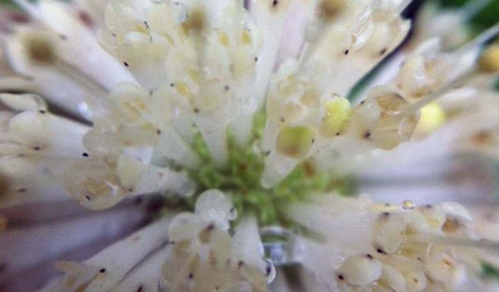 Bloom description: White, tubular flowers huddle close together and emit a long style (a stem that connects the stigma and ovary) from the center. These flowers are quite tropical-looking and stand out during the summer months when the backdrop is dark.