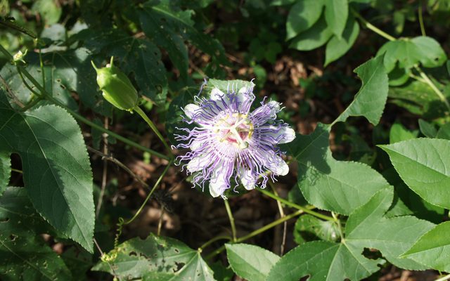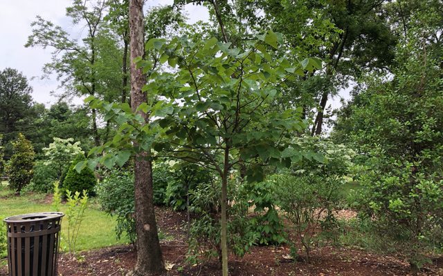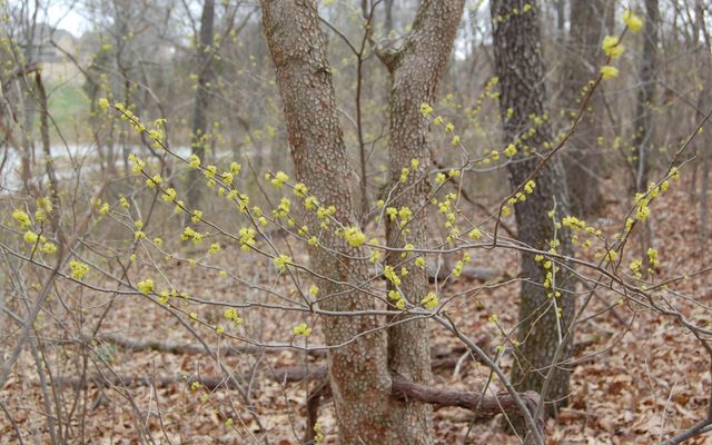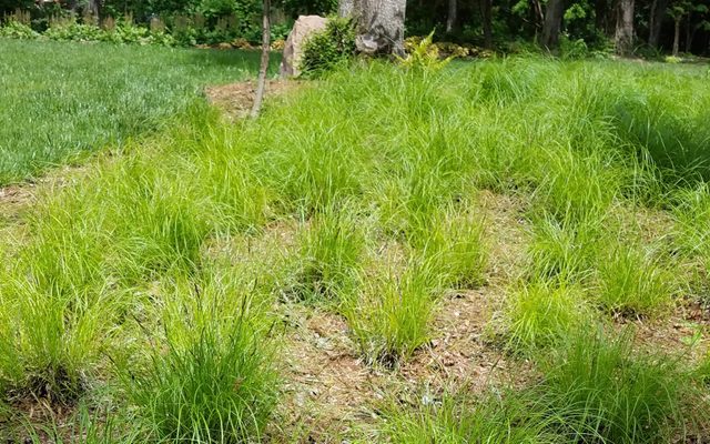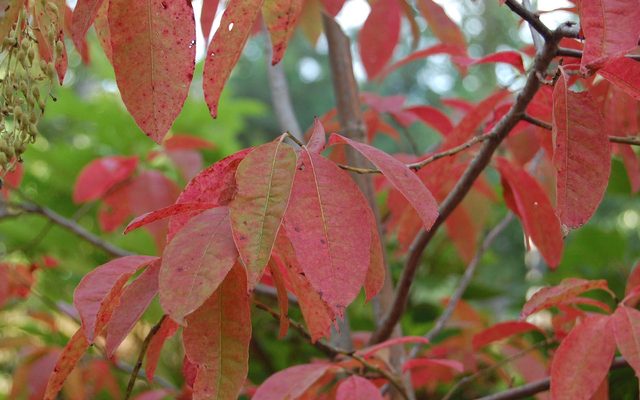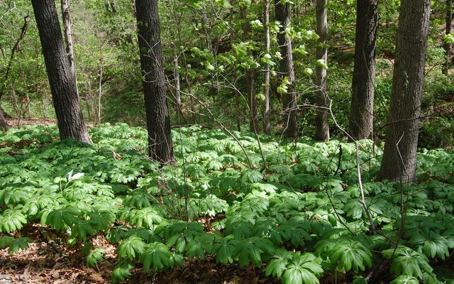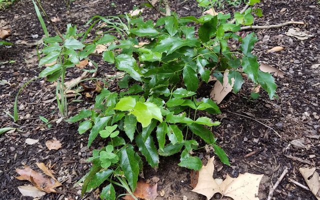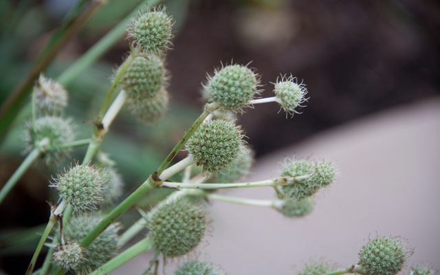 Bright green, rough-textured fruit or seed pod on the ground surrounded by grass and fallen leaves