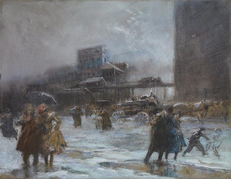 Today is the birthday of Everett Shinn (1876 – 1953), a member of the Ashcan School of painting spearheaded by Robert Henri. Shinn is best known for his paintings of theatres and New York street scenes. He also was one of the few artists who worked largely in pastels. He began his career as an illustrator, working for a number of newspapers in Philadelphia and New York, and the later creating illustrations for popular magazines. His early career at the Philadelphia Press, where he started working in 1893, he referred to as “A school that trained memory and quick perception.” Press artists were required to take in and memorize details of events on the streets of New York and then render them quickly and accurately in clean black-and-white for reproduction. Shinn prided himself on maintaining this ability all his life. In 1893 Shinn became a member of the “Charcoal Club,” a group of artists who were disappointed by the rigid standards of the Pennsylvania Academy and who instead gathered together to socialize, discuss, draw, and critique one another’s work. Other members of the group included John Sloan, Edward Davis (the father of Stuart Davis), William Glackens, George Luks, and Robert Henri, who led the critiques. Shinn would later credit Henri for inspiring him to become a true artist, writing: “It was Robert Henri who set me to painting seriously; without his inspiring friendship and guidance I probably might never have thought of it at all.”