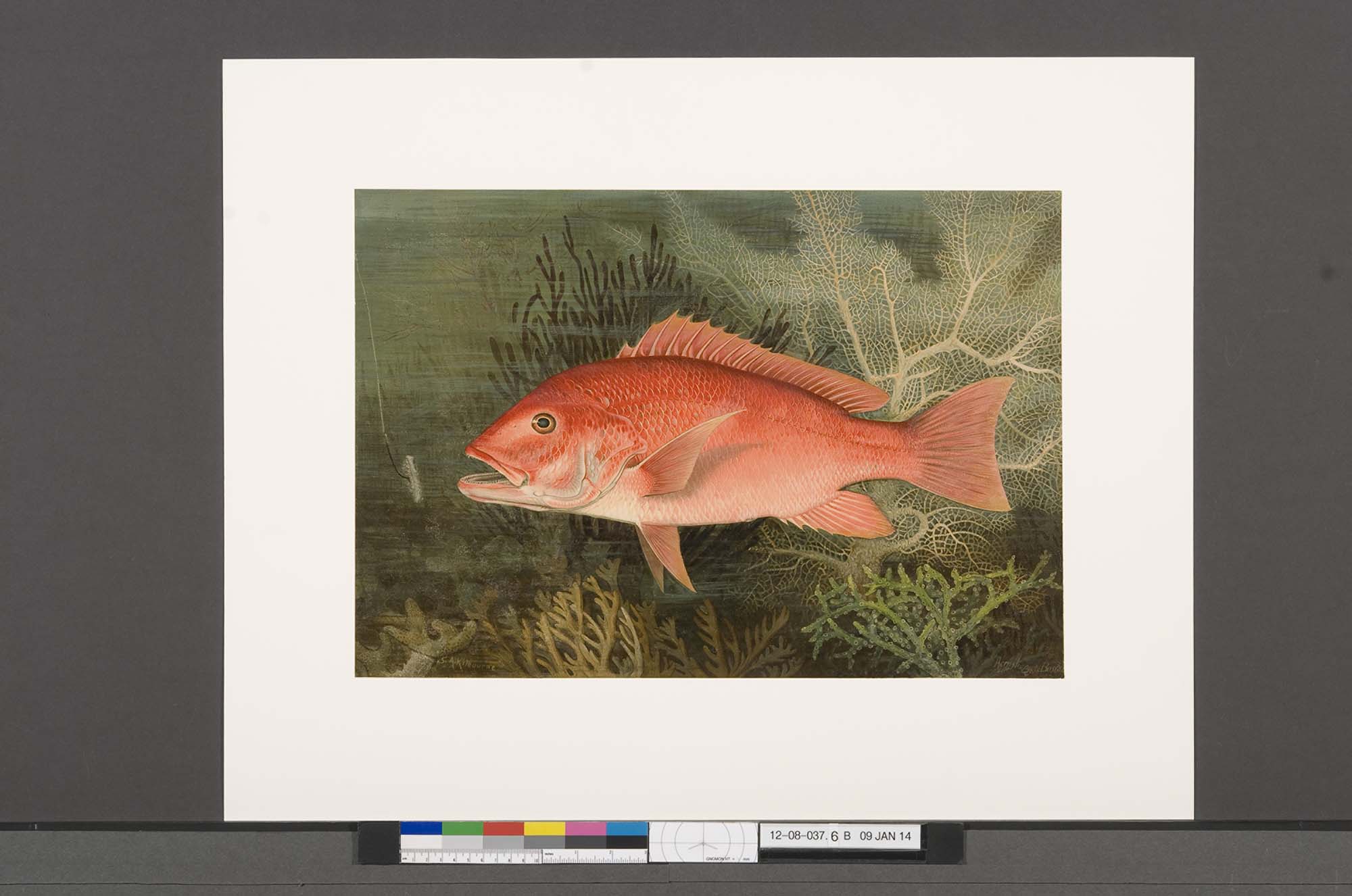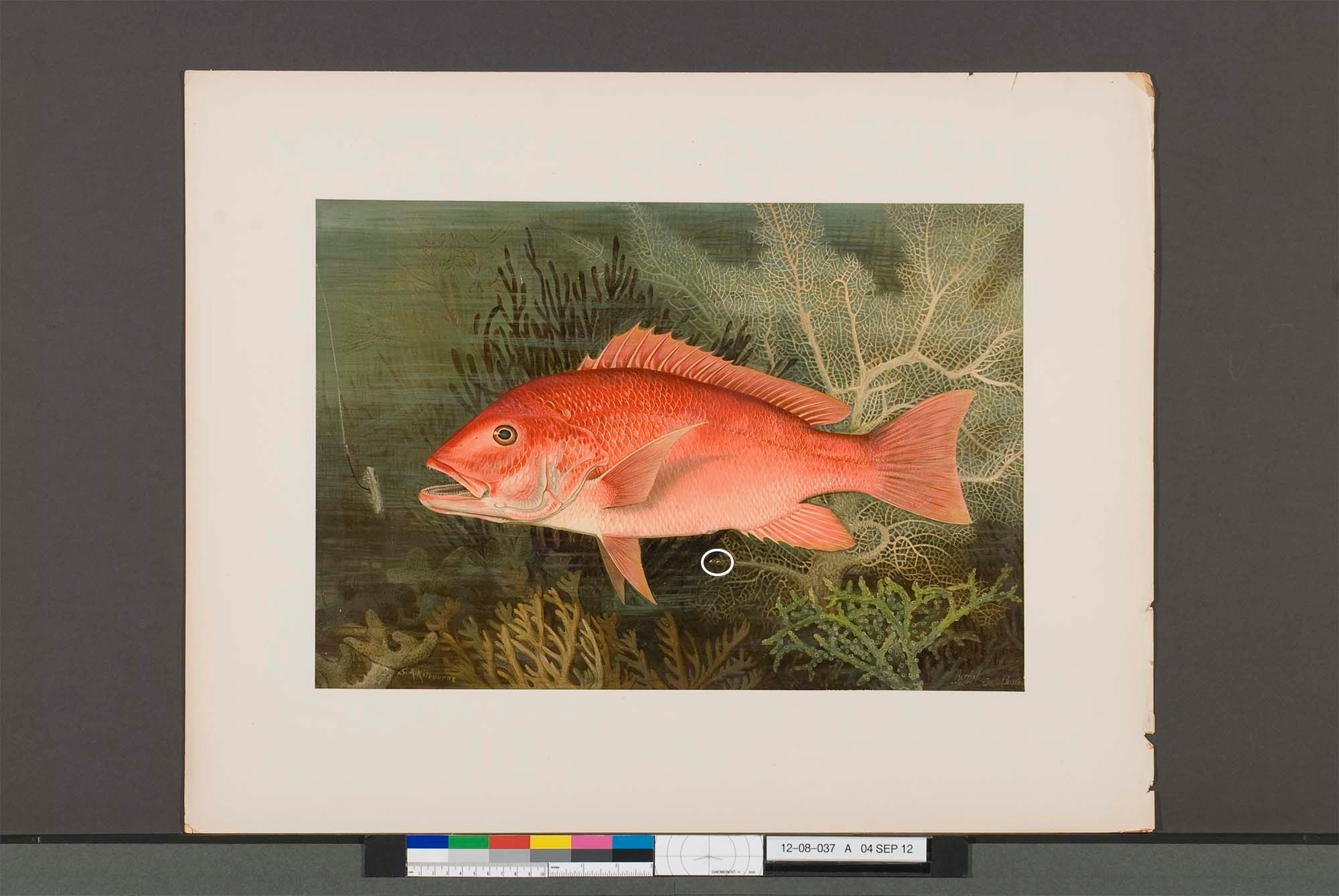 Samuel Kilbourne, Red Snapper from Game Fishes of the United States (New York: Charles Scribner’s Sons, 1879), 1879 – 1880, Chromolithograph, Crystal Bridges Museum of American Art Library, Bentonville, Arkansas. Photography by Heugh-Edmondson Conservation Services, LLC.