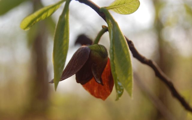 Bright green, rough-textured fruit or seed pod on the ground surrounded by grass and fallen leaves